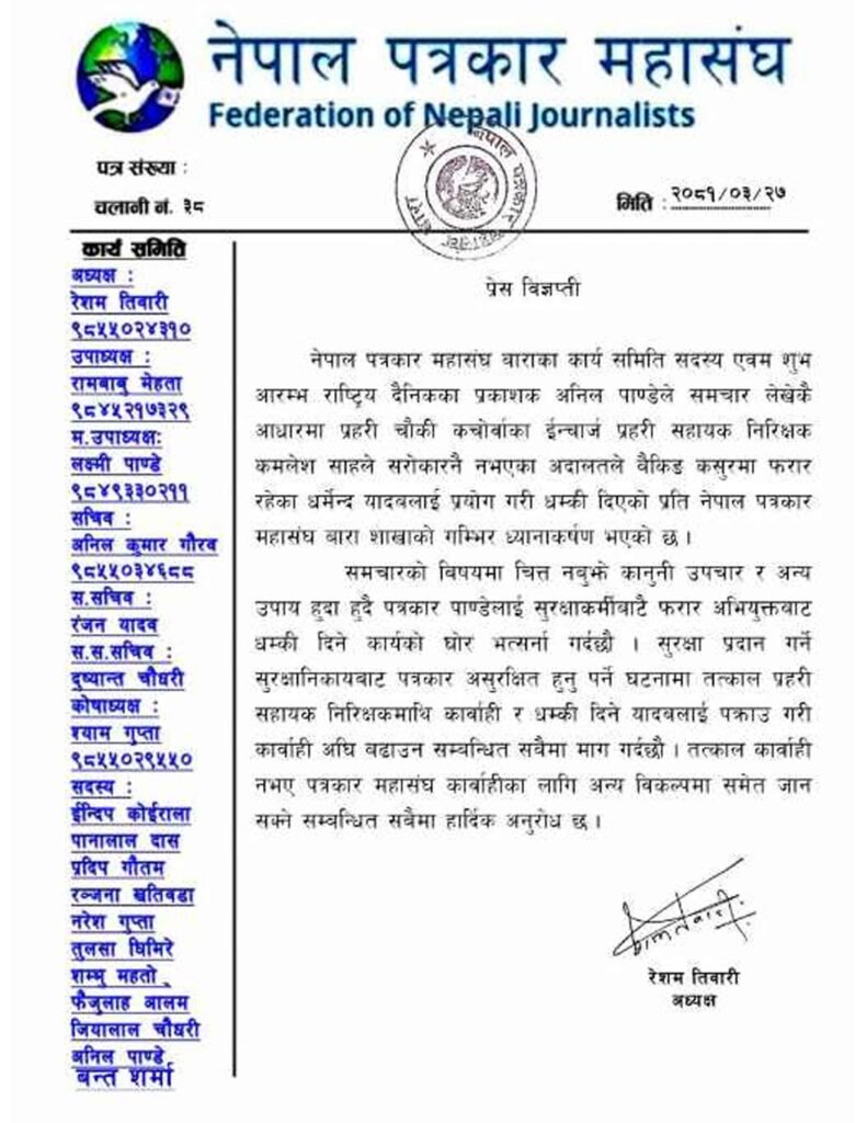 अध्यक्ष तिवारीको हस्ताक्षरमा जारी गरीएको बिज्ञप्ति नेपाल पत्रकार महासंघ बारा शाखाले पत्रकार महासघंका कार्य समिति सदस्य एवम शुभ आरम्भ राष्ट्रिय दैनिकका प्रकाशक अनिल पाण्डेले समचार लेखेकै आधारमा प्रहरी चौकी कचोर्वाका ईन्चार्ज प्रहरी सहायक निरिक्षक कमलेश साहले सरोकारनै नभएका अदालतले बैकिङ कसुरमा फरार रहेका धर्मेन्द यादबलाई प्रयोग गरी धम्की दिएको प्रति नेपाल पत्रकार महासंघ बारा शाखाको गम्भिर ध्यानाकर्षण भएको उल्लेख गरेका छन् ।