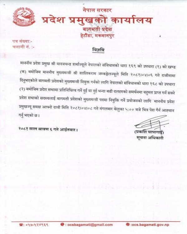 मुख्यमन्त्री शालिकराम जम्मकट्टेलले राजीनामा दिएपछि प्रदेश प्रमुखले नयाँ सरकार गठनको आव्हान गरेका हुन् ।