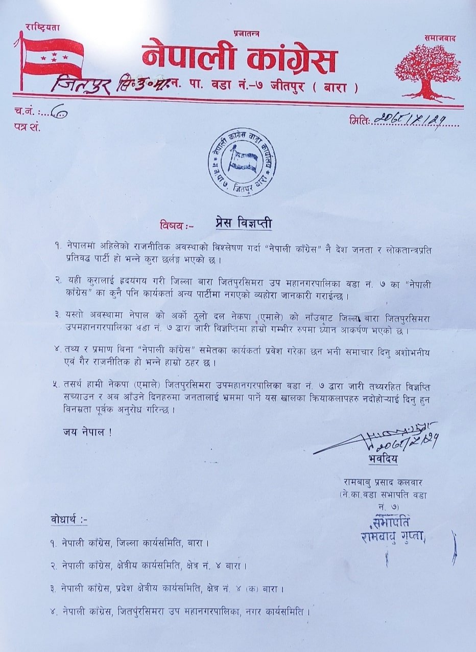 नेपाली कांग्रेस जीतपुर कमिटीद्वारा जारी प्रेस विज्ञप्ति: