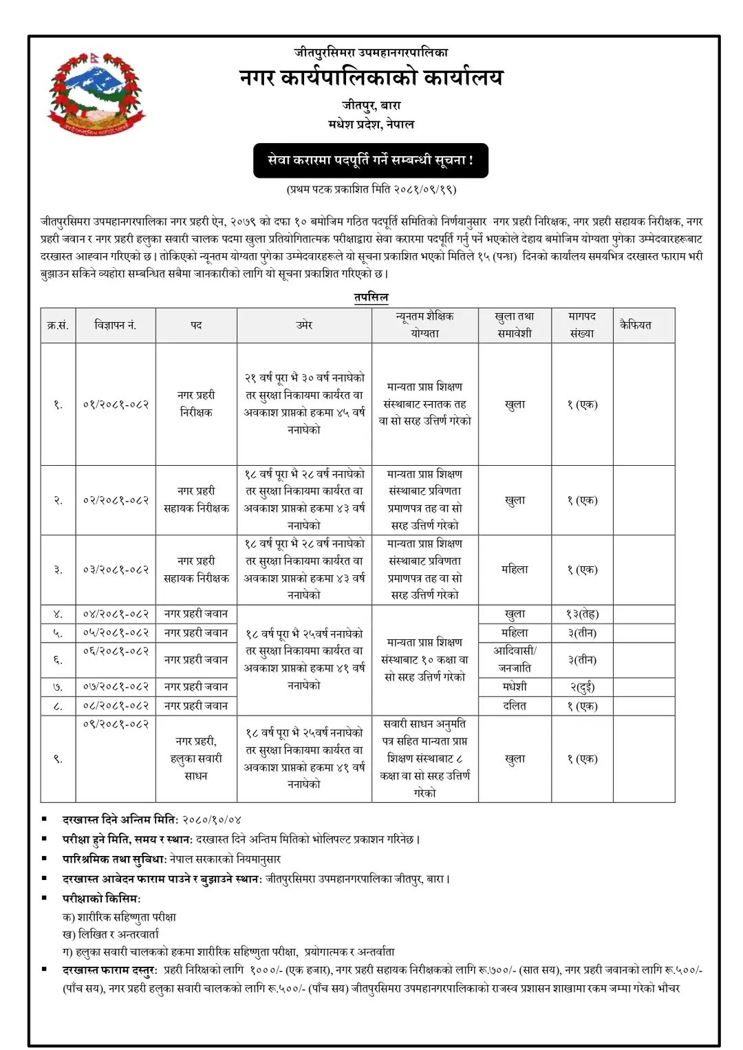 प्रथम पटक जीतपुरसिमरा उपमहानगरपालिकाले २०८० फाल्गुन १४ गते एक नगर प्रहरी सहायक निरीक्षक सहित १३ जना प्रहरी जवानको लागि दर्खास्त आव्हान गरेको थियो ।नगरका योजना कार्यान्वयनका बेला देखिने सुरक्षा समस्या, शान्ति, सुरक्षा र सार्वजनिक सम्पत्तिको रेखदेख तथा संरक्षणका लागि नगर प्रहरी भर्ना गर्न थालिएको जीतपुरसिमरा उपमहानगरपालिकाका नगरप्रमुख राजन पौडेलले बताए ।सूचना अनुसार माघ ४ गतेसम्म इच्छुक नागरिकले आवेदन दिने सक्नेछन् ।नगर प्रहरी निरीक्षकको लागि १ हजार ,नगर प्रहरी सहायक निरिक्षकका लागि ७ सय ,नगर प्रहरी जवानको लागि ५ सय र नगर प्रहरी सवारी चालक पदका लागि ५ सय रुपैयाँ दर्खास्त बापत शुल्क राखिएको जीतपुरसिमरा उपमहानगरपालिकाले जारी गरेको दर्खास्त आव्हान सुचनामा उल्लेख गरिएको छ। साभार: तेराई सन्देश