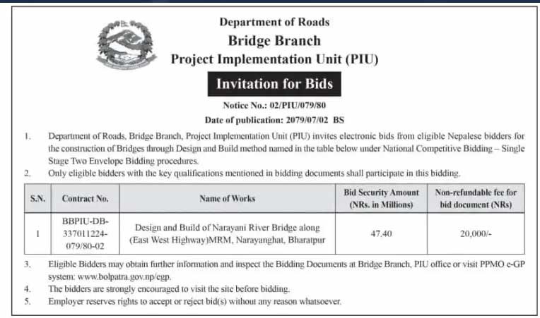 पूर्व–पश्चिम राजमार्ग अन्तर्गत नारायणी नदीमा सिग्नेचर पुल बनाउन ठेक्का आह्वान भएको छ । हाल रहेको पुरानो पुलको आडैमा सिग्नेचर पुल बनाउने गरी ठेक्का आह्वान भएको हो । सडक विभागको पुल शाखाले डिजाइन एण्ड बिल्डको मोडलमा सिग्नेचर पुल बनाउने गरी आज ठेक्का आह्वान गरेको हो । बहुप्रतिक्षित सिग्नेचर पुल निर्माणको लागि ठेक्का आह्वान भएपछि भरतपुर महानगरपालिकाकी मेयर रेनु दाहालले बधाई दिएकी छन् ।