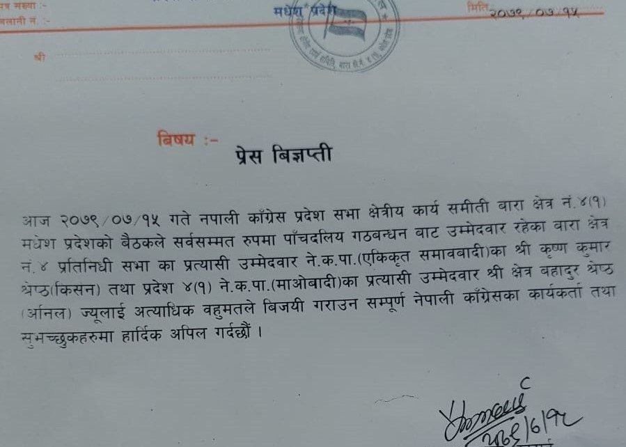 मंगलबार बाराको जीतपुरस्थित काँग्रेस पार्टी कार्यालयमा बसेको क्षेत्रीय समितिको बैठकले मंसिर ४ गते हुने प्रतिनिधि तथा प्रदेश सभा निर्वाचनमा काँग्रेस नेतृत्वको पाँच दलीय गठबन्धनका उम्मेदवार कृष्णकुमार श्रेष्ठ र प्रदेश सभा सदस्यका उम्मेदवार क्षेत्रबहादुर श्रेष्ठलाई विजयी गराउन नेपाली काँग्रेसका कार्यकर्ता तथा शुभेच्छुकहरुमा आग्रह गरेको हो ।