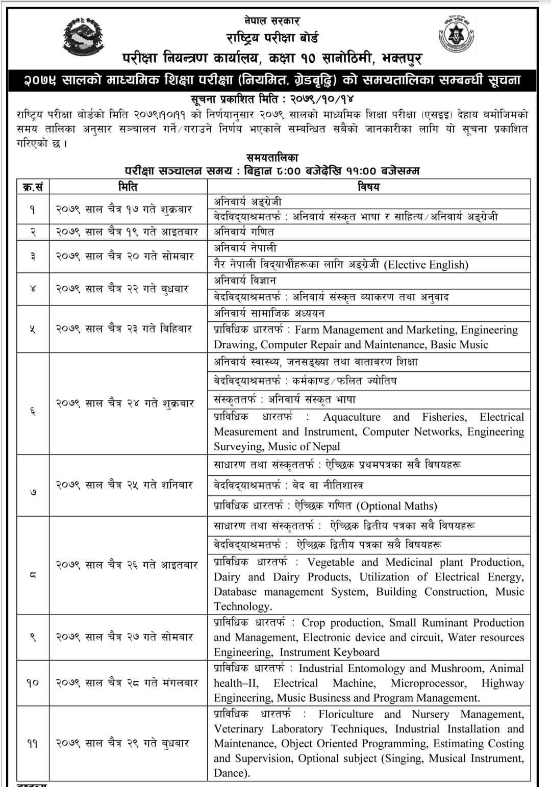 राष्ट्रिय परीक्षा बोर्डले यस वर्षको माध्यमिक शिक्षा परीक्षा (एसईई) परीक्षा तालिका सार्वजनिक गरेको छ। बोर्डको निर्णय अनुसार एसईई चैत १७ गते देखि चैत २९ गतेसम्म हुने भएको छ। परीक्षा बिहान ८ बजेदेखि ११ बजेसम्म हुनेछ।
