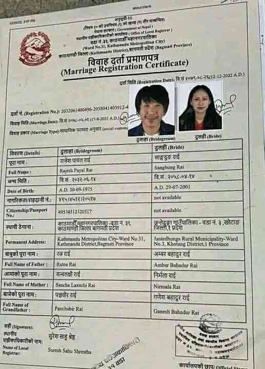 गायक राजेशपायल राईले प्रेमिका साङबुङ राईसँग विवाह गरेका छन्। लिभिङ टुगेदरमा बस्दै आएका उनीहरुले केही समयअघि नै विवाह दर्ता गरेको प्रमाणपत्र सार्वजनिक भएको हो। गत मंसिर २६ गते काठमाडौं महानगरपालिका–३१ को वडा कार्यालयमा विवाह दर्ता गरेको उल्लेख छ।