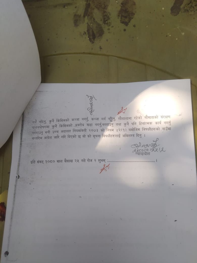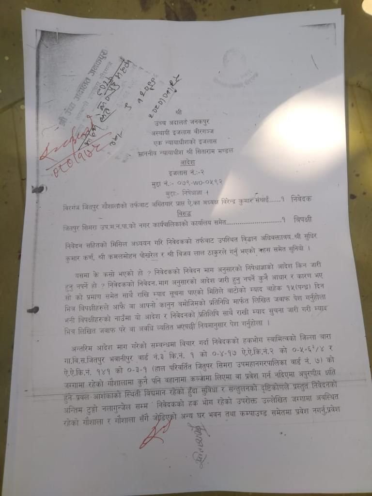 यता जीतपुरसिमरा उपमहानगरपालिकाले गौशालाले बनाएको संरचना भत्काए पछि गौशाला पछले उच्च अदालत जनकपुर स्थायी इजलास विरगञ्जबाट अन्तरिम आदेश ल्याएको थियो ।