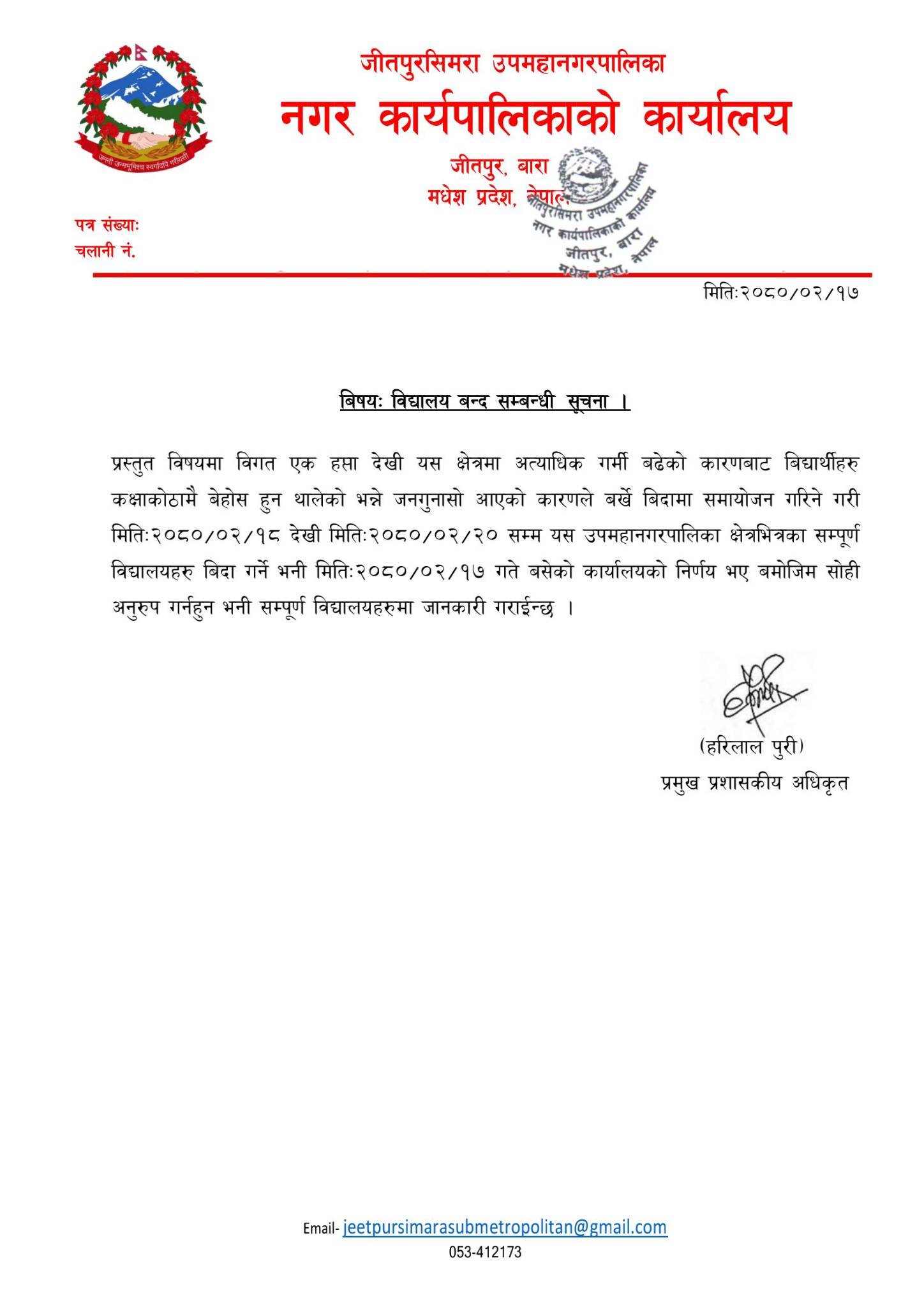 जीतपुरसिमरा उपमहानगरले बुधकार एक सुचना जारी गर्दै जेष्ठ १८ गते देखी जेष्ठ २० गते सम्म विद्यालय बन्द गर्ने निदेर्शन दिएको हो ।