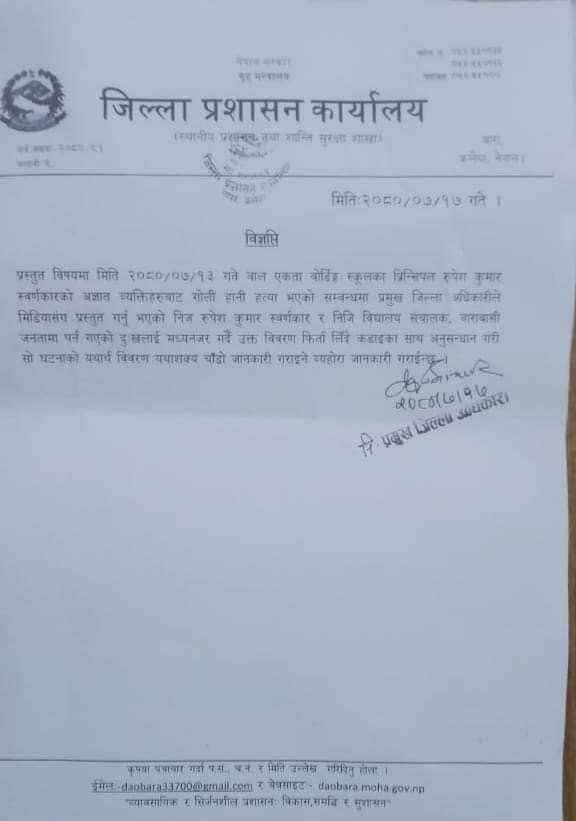 जिल्ला प्रशासन कार्यालय बाराका प्रमुख जिल्ला अधिकारीले रुपेश स्वर्णकार हत्या प्रकरणमा दिएका अभिव्यक्ति फिर्ता लिएका छन्। स्वर्णकारको चरित्र हत्या हुने गरि दिएका अभिव्यक्ति फिर्ता लिएका हुन् ।