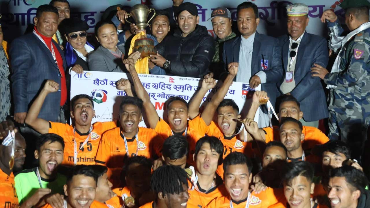 मकवानपुर, २७ माघ । मकवानपुर गोल्डकप फुटबल प्रतियोगिताको फाइनलमा एपीएफले एनआरटीलाई हराउँदै उपाधि जितेको छ। हेटौंडा स्थित गौरीटार रंगशालामा भएको फाइनल खेलमा निर्धारित ९० मिनेटमा गोलरहित बराबरी भएपछि खेल अतिरिक्त समयमा गएको थियो।